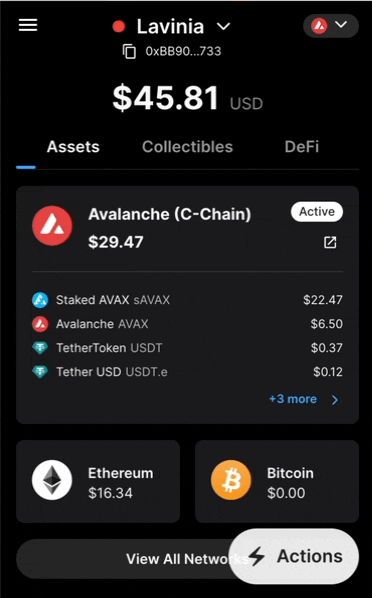 ``` ## Layout Structure The component uses a flex layout with: - Left side: TokenChip (icon, name, and symbol) - Right side (if balance provided): - Token balance (3 decimal places) - USD value (currently hardcoded to $0) - Proper spacing and alignment - Optional hover and click interactions # TransactionButton (/docs/builderkit/components/transaction/transaction-button) --- title: TransactionButton description: "A button component that handles blockchain transaction submission with built-in status tracking and notifications." --- # TransactionButton The TransactionButton component handles individual transaction submission with built-in status tracking and notifications. ## Usage ```tsx import { TransactionButton } from '@avalabs/builderkit'; // Basic usage // With callbacks { console.log('Transaction sent at:', timestamp); }} onTransactionConfirmed={(receipt) => { console.log('Transaction confirmed:', receipt); }} /> ``` ## Props | Prop | Type | Default | Description | |------|------|---------|-------------| | `chain_id` | `number` | - | Chain ID for the transaction | | `title` | `string` | - | Transaction title | | `description` | `string` | - | Transaction description | | `data` | `any` | - | Transaction data | | `onTransactionSent` | `(timestamp: number) => void` | - | Called when transaction is sent | | `onTransactionConfirmed` | `(receipt: any) => void` | - | Called when transaction is confirmed | | `className` | `string` | - | Additional CSS classes | ## Features - Automatic wallet connection handling - Network switching support - Transaction status tracking - Toast notifications with explorer links - Loading states and error handling ## Examples ### Basic Transaction ```tsx ``` ### With Custom Styling ```tsx ``` ## Component States 1. **Not Connected** - Shows "Connect Wallet" button - Handles wallet connection 2. **Wrong Network** - Shows "Wrong Network" button - Handles network switching 3. **Ready** - Shows transaction button - Enables transaction submission 4. **Processing** - Shows loading indicator - Tracks transaction status ## Notifications The component provides toast notifications for: - Transaction sent - Transaction confirmed - Transaction failed Each notification includes: - Timestamp - Transaction explorer link - Appropriate styling # TransactionManager (/docs/builderkit/components/transaction/transaction-manager) --- title: TransactionManager description: "A component that orchestrates multiple blockchain transactions in sequence." --- # TransactionManager The TransactionManager component orchestrates multiple blockchain transactions in sequence, handling the flow between steps and providing status tracking. ## Usage ```tsx import { TransactionManager } from '@avalabs/builderkit'; // Basic usage { console.log('Step completed at:', timestamp); }} onTransactionConfirmed={(receipt) => { console.log('All transactions completed:', receipt); }} /> ``` ## Props | Prop | Type | Default | Description | |------|------|---------|-------------| | `chain_id` | `number` | - | Chain ID for the transactions | | `transactions` | `TransactionProps[]` | - | Array of transactions to process | | `onTransactionSent` | `(timestamp: number) => void` | - | Called when a step completes | | `onTransactionConfirmed` | `(receipt: any) => void` | - | Called when all transactions complete | | `className` | `string` | - | Additional CSS classes | ## Features - Sequential transaction execution - Step-by-step progress tracking - Automatic state management - Transaction dependency handling - Consistent error handling - Status notifications for each step ## Examples ### Token Approval and Transfer ```tsx ``` ### Multi-step Protocol Interaction ```tsx ``` ## Transaction Flow 1. **Initialization** - Validates transaction array - Sets up initial state - Prepares first transaction 2. **Step Execution** - Processes current transaction - Waits for confirmation - Updates progress state 3. **Step Transition** - Validates completion - Moves to next transaction - Updates UI state 4. **Completion** - Confirms all steps finished - Triggers completion callback - Resets internal state # avax.getAtomicTx (/docs/rpcs/c-chain/avalanche/avax_getAtomicTx) --- title: avax.getAtomicTx full: true _openapi: method: POST route: /ext/bc/C/avax#avax.getAtomicTx toc: [] structuredData: headings: [] contents: - content: Returns the specified atomic transaction. --- {/* This file was generated by Fumadocs. Do not edit this file directly. Any changes should be made by running the generation command again. */} Returns the specified atomic transaction. # avax.getAtomicTxStatus (/docs/rpcs/c-chain/avalanche/avax_getAtomicTxStatus) --- title: avax.getAtomicTxStatus full: true _openapi: method: POST route: /ext/bc/C/avax#avax.getAtomicTxStatus toc: [] structuredData: headings: [] contents: - content: Returns the status of the specified atomic transaction. --- {/* This file was generated by Fumadocs. Do not edit this file directly. Any changes should be made by running the generation command again. */} Returns the status of the specified atomic transaction. # avax.getUTXOs (/docs/rpcs/c-chain/avalanche/avax_getUTXOs) --- title: avax.getUTXOs full: true _openapi: method: POST route: /ext/bc/C/avax#avax.getUTXOs toc: [] structuredData: headings: [] contents: - content: Gets all UTXOs for the specified addresses. --- {/* This file was generated by Fumadocs. Do not edit this file directly. Any changes should be made by running the generation command again. */} Gets all UTXOs for the specified addresses. # avax.issueTx (/docs/rpcs/c-chain/avalanche/avax_issueTx) --- title: avax.issueTx full: true _openapi: method: POST route: /ext/bc/C/avax#avax.issueTx toc: [] structuredData: headings: [] contents: - content: Issues a transaction to the network. --- {/* This file was generated by Fumadocs. Do not edit this file directly. Any changes should be made by running the generation command again. */} Issues a transaction to the network. # eth_sugge