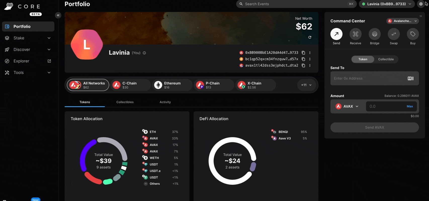 ); } ``` ## Cross-Chain Operations JSON-RPC accounts support cross-chain operations through the Avalanche Client SDK: ```typescript // P-Chain export transaction const pChainExportTxn = await walletClient.pChain.prepareExportTxn({ destinationChain: "C", fromAddress: address, exportedOutput: { addresses: [address], amount: avaxToWei(0.001), }, }); const txHash = await walletClient.sendXPTransaction(pChainExportTxn); ``` ## Best Practices ### 1. Check Provider Availability ```typescript // Always check if the provider is available if (typeof window !== "undefined" && window.avalanche) { // Core is available } else if (typeof window !== "undefined" && window.ethereum) { // MetaMask is available } else { // No wallet provider found } ``` ### 2. Handle Network Switching ```typescript // Check if wallet is on the correct network const currentChainId = await walletClient.getChainId(); if (currentChainId !== avalanche.id) { await walletClient.switchChain({ id: avalanche.id }); } ``` ### 3. Graceful Error Handling ```typescript const handleWalletError = (error: any) => { switch (error.code) { case 4001: return "User rejected the request"; case -32002: return "Request already pending"; case -32602: return "Invalid parameters"; default: return error.message || "Unknown error occurred"; } }; ``` ## Troubleshooting ### Common Issues **Provider Not Found** ```typescript // Check if provider exists if (!window.avalanche && !window.ethereum) { throw new Error("No wallet provider found. Please install Core or MetaMask."); } ``` **Wrong Network** ```typescript // Ensure wallet is on the correct network const chainId = await walletClient.getChainId(); if (chainId !== avalanche.id) { await walletClient.switchChain({ id: avalanche.id }); } ``` **User Rejection** ```typescript try { await walletClient.send({ to: address, amount: 0.001 }); } catch (error) { if (error.code === 4001) { console.log("User rejected transaction"); } } ``` ## Next Steps - **[Local Accounts](accounts/local)** - Learn about local account management - **[Wallet Operations](methods/wallet-methods/wallet)** - Learn how to send transactions - **[Cross-Chain Transfers](methods/wallet-methods/wallet#cross-chain-transfers)** - Moving assets between chains # Network-Specific Addresses (/docs/tooling/avalanche-sdk/client/accounts/local/addresses) --- title: "Network-Specific Addresses" icon: "map-pin" --- ## Overview Avalanche uses different address formats for each chain. EVM addresses work the same across networks, but XP addresses use network-specific HRPs (Human-Readable Prefixes). ## Address Formats ### EVM Addresses (C-Chain) EVM addresses are the same across all networks: ```typescript const evmAddress = account.getEVMAddress(); // 0x742d35Cc... ``` ### XP Addresses (X/P-Chain) XP addresses use network-specific HRPs: ```typescript // Mainnet const mainnetX = account.getXPAddress("X", "avax"); // X-avax1... const mainnetP = account.getXPAddress("P", "avax"); // P-avax1... // Testnet (Fuji) const fujiX = account.getXPAddress("X", "fuji"); // X-fuji1... const fujiP = account.getXPAddress("P", "fuji"); // P-fuji1... ``` ## Network Configuration ```typescript // Mainnet addresses const mainnet = { evm: account.getEVMAddress(), xChain: account.getXPAddress("X", "avax"), pChain: account.getXPAddress("P", "avax"), }; // Testnet addresses const testnet = { evm: account.getEVMAddress(), xChain: account.getXPAddress("X", "fuji"), pChain: account.getXPAddress("P", "fuji"), }; ``` ## Next Steps - **[Account Utilities](accounts/local/utilities)** - Account validation and utilities - **[Using Accounts with Clients](accounts/local/clients)** - Client integration patterns # Using Accounts with Clients (/docs/tooling/avalanche-sdk/client/accounts/local/clients) --- title: "Using Accounts with Clients" icon: "link" --- ## Overview Accounts work with both public clients (read-only) and wallet clients (transactions). You can hoist the account into the client or pass it to each method. ## Public Client (Read-Only) ```typescript import { createAvalancheClient } from "@avalanche-sdk/client"; import { avalanche } from "@avalanche-sdk/client/chains"; import { privateKeyToAvalancheAccount } from "@avalanche-sdk/client/accounts"; const client = createAvalancheClient({ chain: avalanche, transport: { type: "http" }, }); const account = privateKeyToAvalancheAccount("0x..."); // Read operations const balance = await client.getBalance({ address: account.getEVMAddress() }); const height = await client.pChain.getHeight(); ``` ## Wallet Client (Transactions) ```typescript import { createAvalancheWalletClient } from "@avalanche-sdk/client"; import { avalanche } from "@avalanche-sdk/client/chains"; import { privateKeyToAvalancheAccount } from "@avalanche-sdk/client/accounts"; import { avaxToWei } from "@avalanche-sdk/client/utils"; const account = privateKeyToAvalancheAccount("0x..."); // Hoist account (recommended) const walletClient = createAvalancheWalletClient({ account, // Account is hoisted chain: avalanche, transport: { type: "http" }, }); // C-Chain transaction const txHash = await walletClient.send({ to: "0x742d35Cc6634C0532925a3b8D4C9db96C4b4d8b6", amount: avaxToWei(0.001), }); // X/P-Chain transaction const xpTx = await walletClient.xChain.prepareBaseTxn({ outputs: [{ addresses: [account.getXPAddress("X")], amount: 1 }], }); await walletClient.sendXPTransaction(xpTx); ``` ## Account Hoisting You can hoist the account into the client (recommended) or pass it to each method: ```typescript // Hoisted (recommended) const walletClient = createAvalancheWalletClient({ account, // No need to pass to each method chain: avalanche, transport: { type: "http" }, }); await walletClient.send({ to: "0x...", amount: 0.001 }); // Or pass per method const walletClient = createAvalancheWalletClient({ chain: avalanche, transport: { type: "http" }, }); await walletClient.send({ account, to: "0x...", amount: 0.001 }); ``` ## Cross-Chain Operations Cross-chain transfers use the export/im